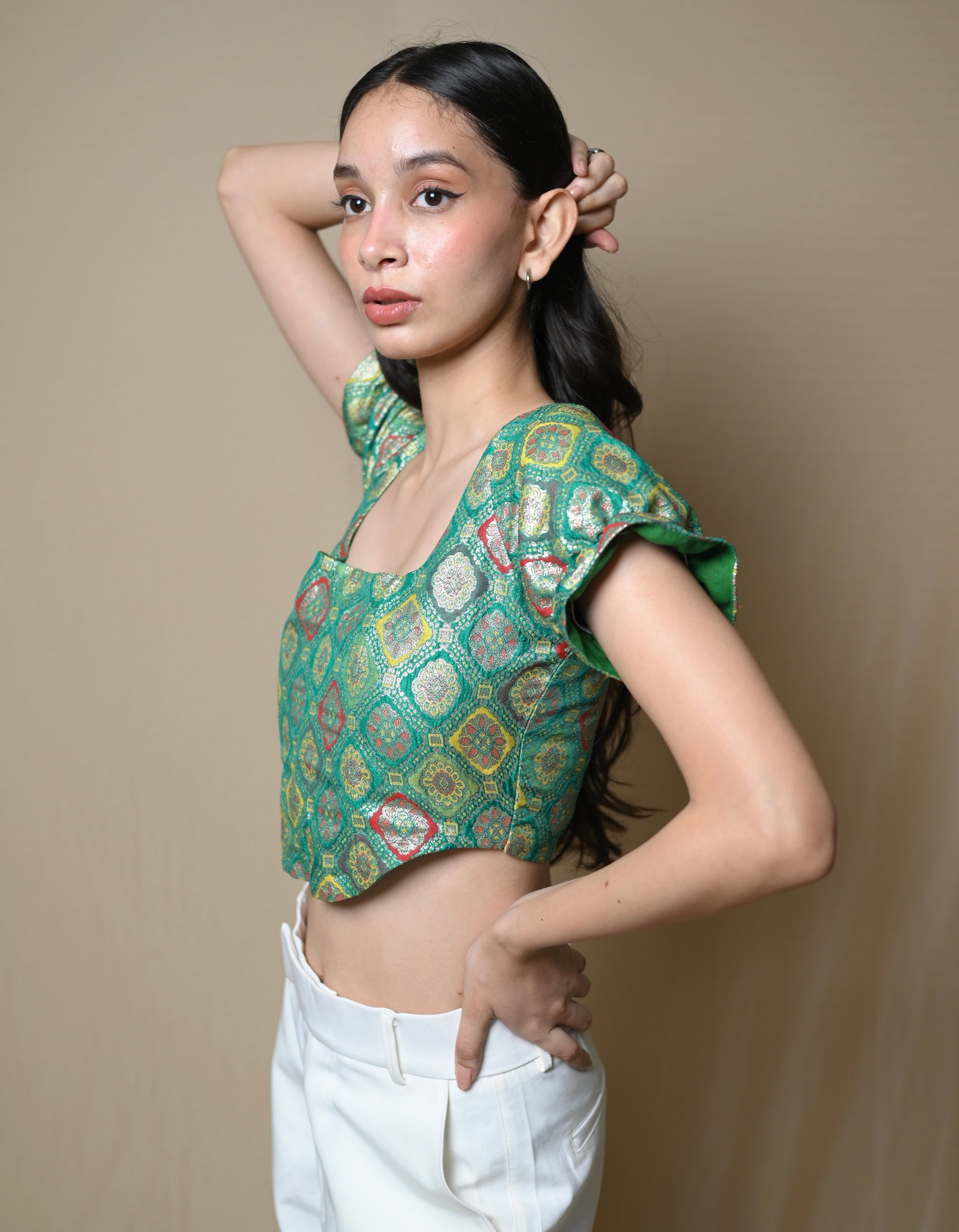 A refreshing twist to tradition — Hari Preet blends the grandeur of Banarasi brocade with a structured corset silhouette. Featuring gathered sleeves and a flattering square neckline, this blouse is designed to hug your curves and hold attention. The back zip detail adds a modern edge while the regal motifs in sea green and gold shimmer under every light.