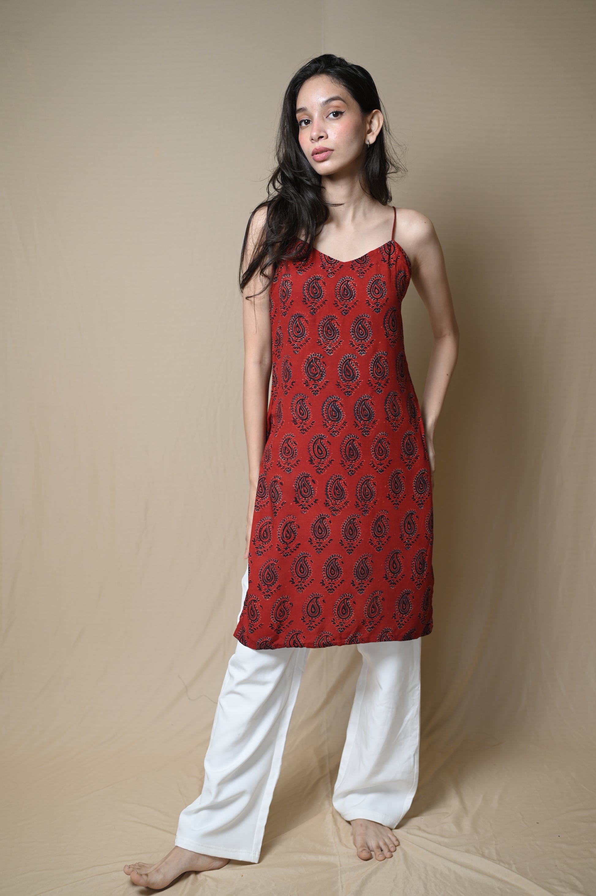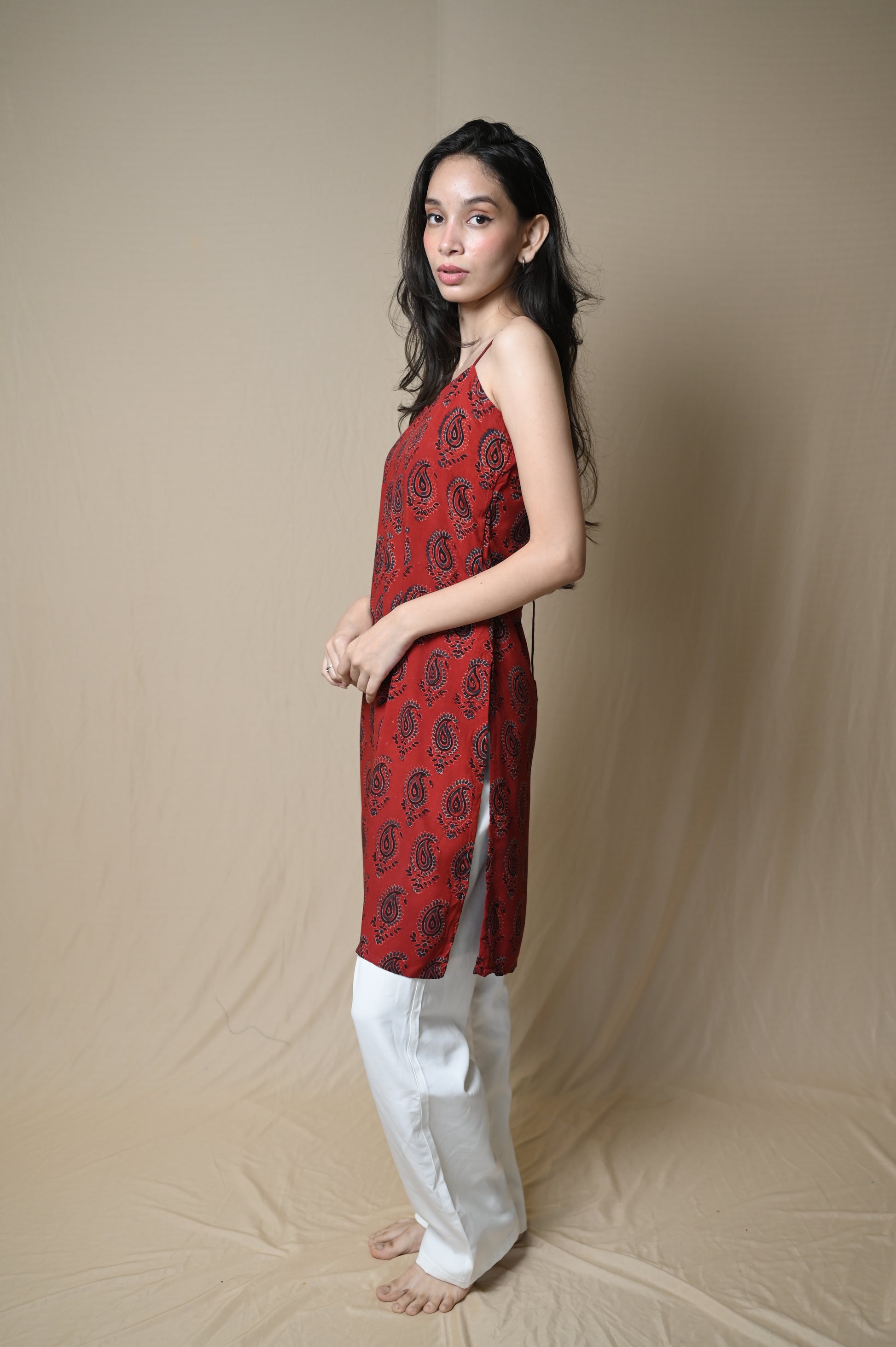 Bring effortless charm to your wardrobe with the Laali Strappy Back Kurti – a striking fusion of classic print and modern detailing. Designed in a timeless red hue adorned with Ajrakh hand block & natural dyed black paisley motifs, this lightweight kurti top is a versatile must-have for both casual and semi-formal occasions.