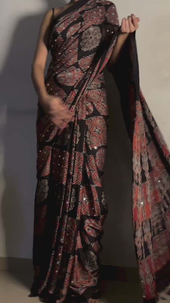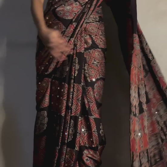 Experience the elegance of tradition with our pure modal silk saree, crafted using authentic Ajrak handblock printing.