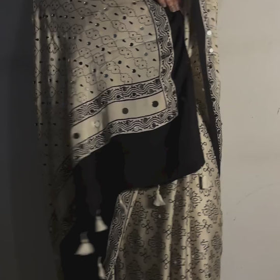 Each piece is adorned with real hand-glued mirrors, adding a subtle yet stunning sparkle to the classic Ajrak patterns.