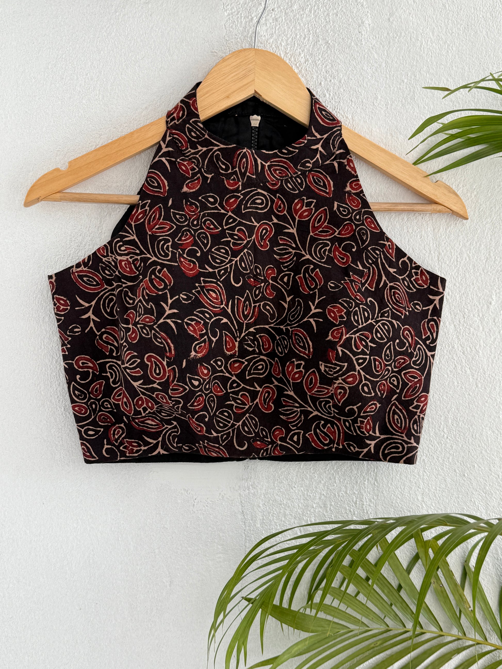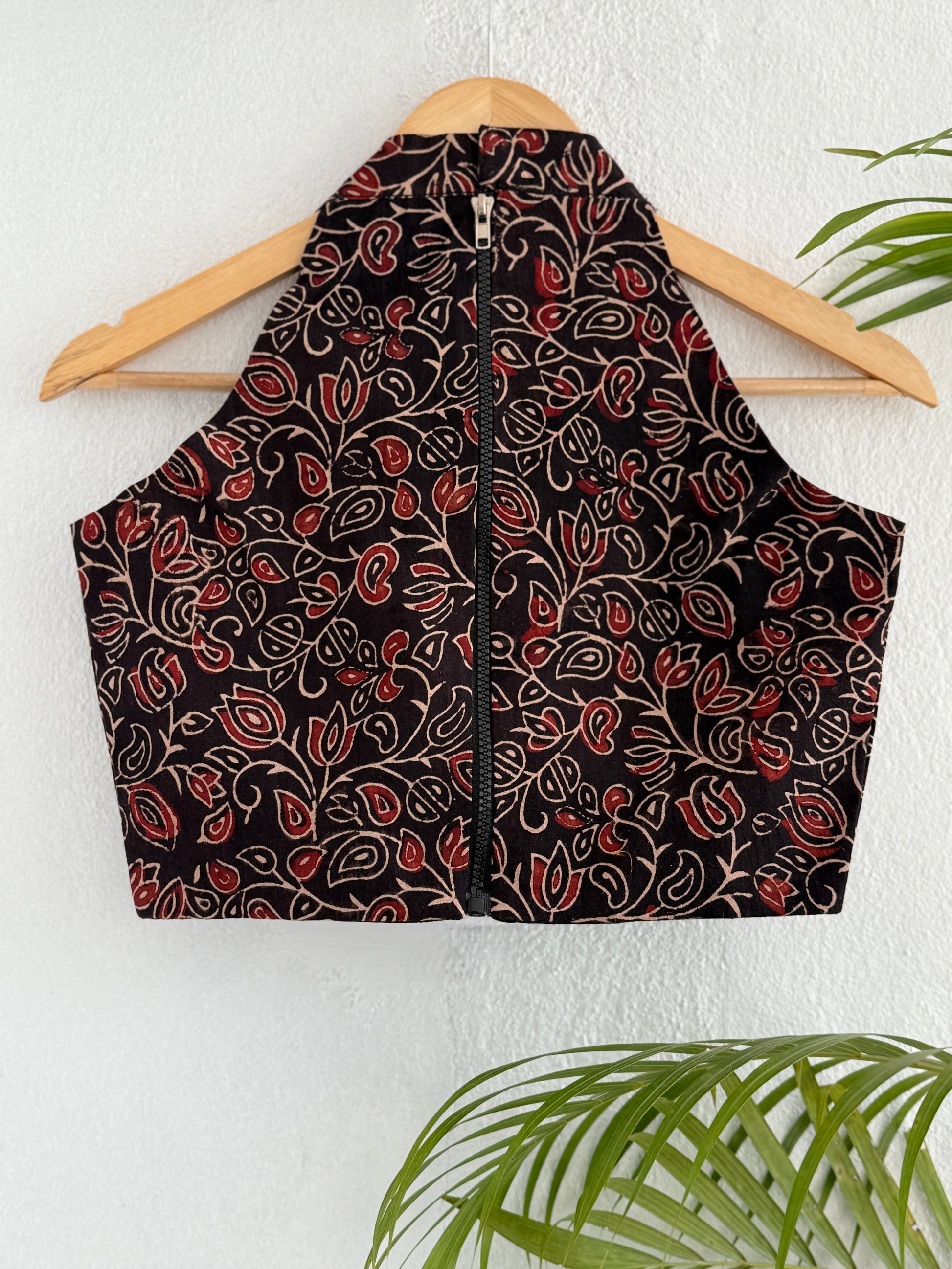 Elevate your wardrobe with the Pushpika Halter Crop Top, a modern silhouette infused with timeless tradition. Crafted from breathable, ajrakh hand-block printed cotton, this top features a rich floral motif in earthy reds and creams on a deep black base—an ode to nature’s effortless beauty.